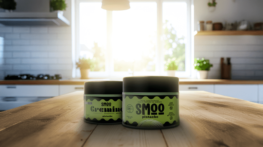 O SMOO Pistache é feito com pistaches selecionados da Califórnia, leite argentino e Whey Protein, resultando em uma base rica e densa que, ao ser batida com leite gelado, se transforma em até 1 litro de sorvete cremoso e leve, com apenas 52 kcal por porção.
