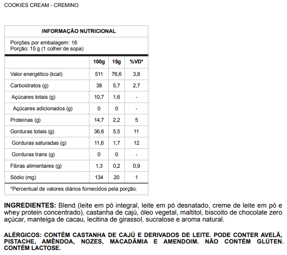 O CREMINO Cookies & Cream foi criado para levar o sorvete SMOO a outro nível. Feito com leite em pó argentino, creme de leite e manteiga de cacau, esse creme é extremamente cremoso e indulgente, com pedaços de biscoitos crocantes espalhados por todo o creme. Além da textura rica e sabor marcante, o CREMINO Cookies & Cream também é enriquecido com Whey Protein e não possui adição de açúcares, mantendo o equilíbrio perfeito entre prazer e funcionalidade.