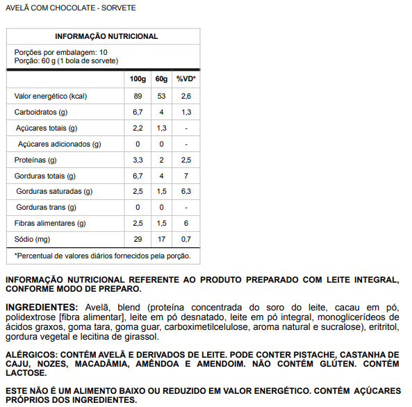 Cada porção de 60g (equivalente a uma bola de sorvete pronto) contém apenas 53 kcal, cerca de 50% menos calorias do que sorvetes tradicionais.